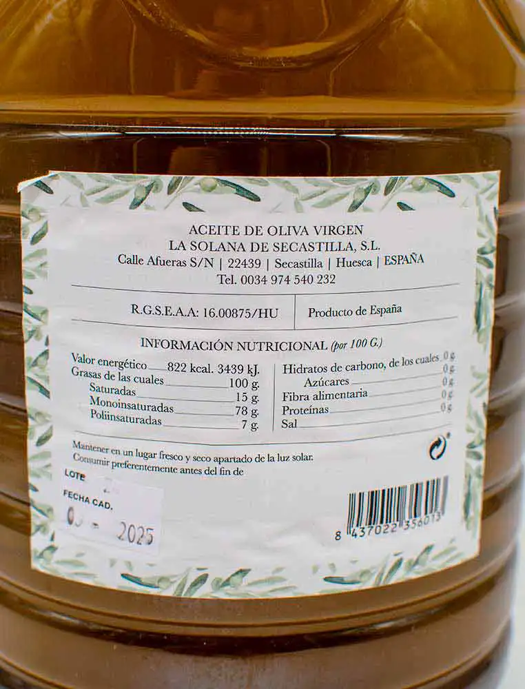 El Aceite de Oliva Virgen Secastilla lo podemos encontrar en botellas de 1, 2l ó 5 l en función del uso que le vayamos a dar. Elaborado con las variedades habituales del Bajo Aragón como verdeña, empeltre, hojiblanca y negral.